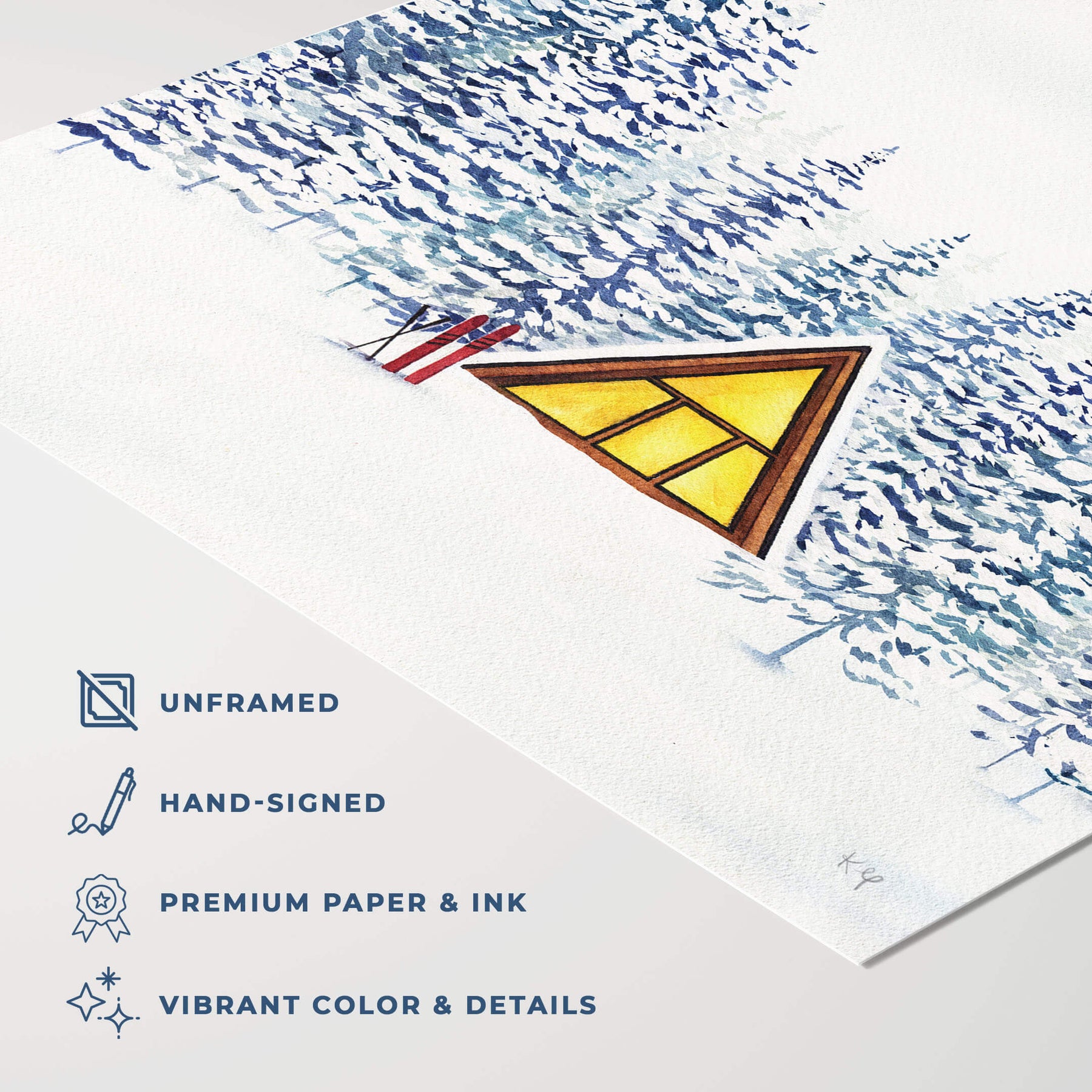 Add adventure and whimsy to your room with this peaceful watercolor landscape of a snowy a-frame cabin in the woods! Don't forget to check out the rest of my shop for outdoor, adventure inspired prints, cards, and stickers. Perfect for any nature lover.