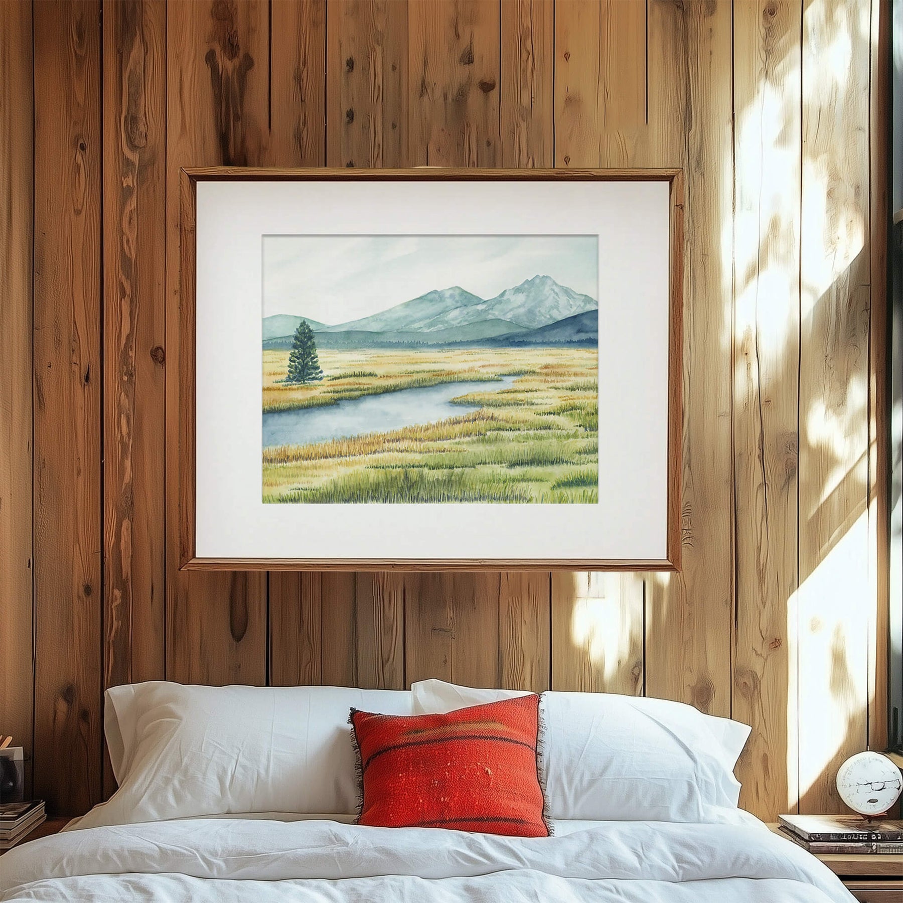 A peaceful view of golden meadows, calm water, and the distant rise of the Three Sisters mountain range. This print captures the quiet beauty of high desert landscapes and brings it into your space.