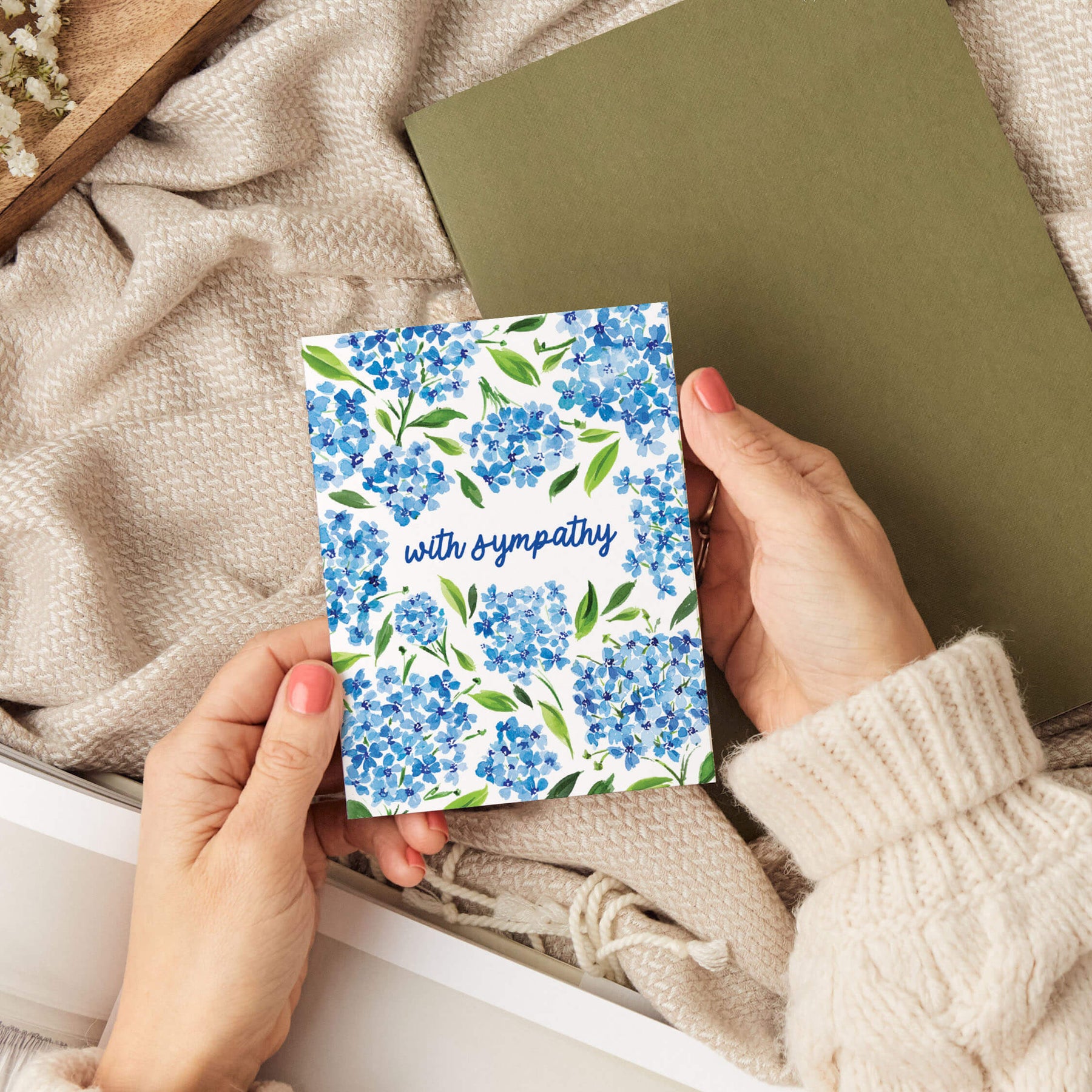 This sympathy card features soft blue floral artwork with the message “With Sympathy,” offering a gentle way to express care and support during a difficult time. Calm colors and a timeless floral pattern make this card a thoughtful choice for moments of loss and remembrance.