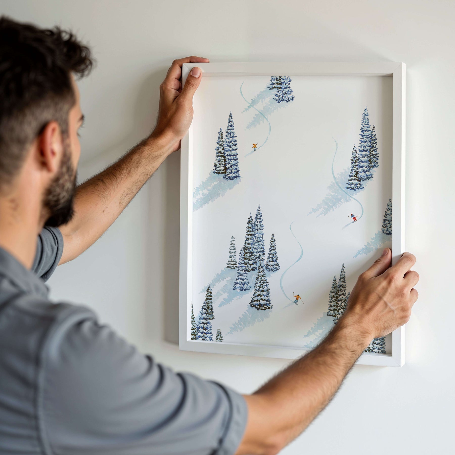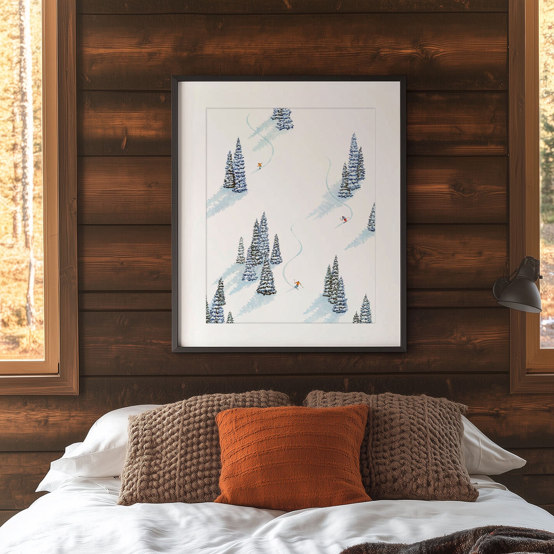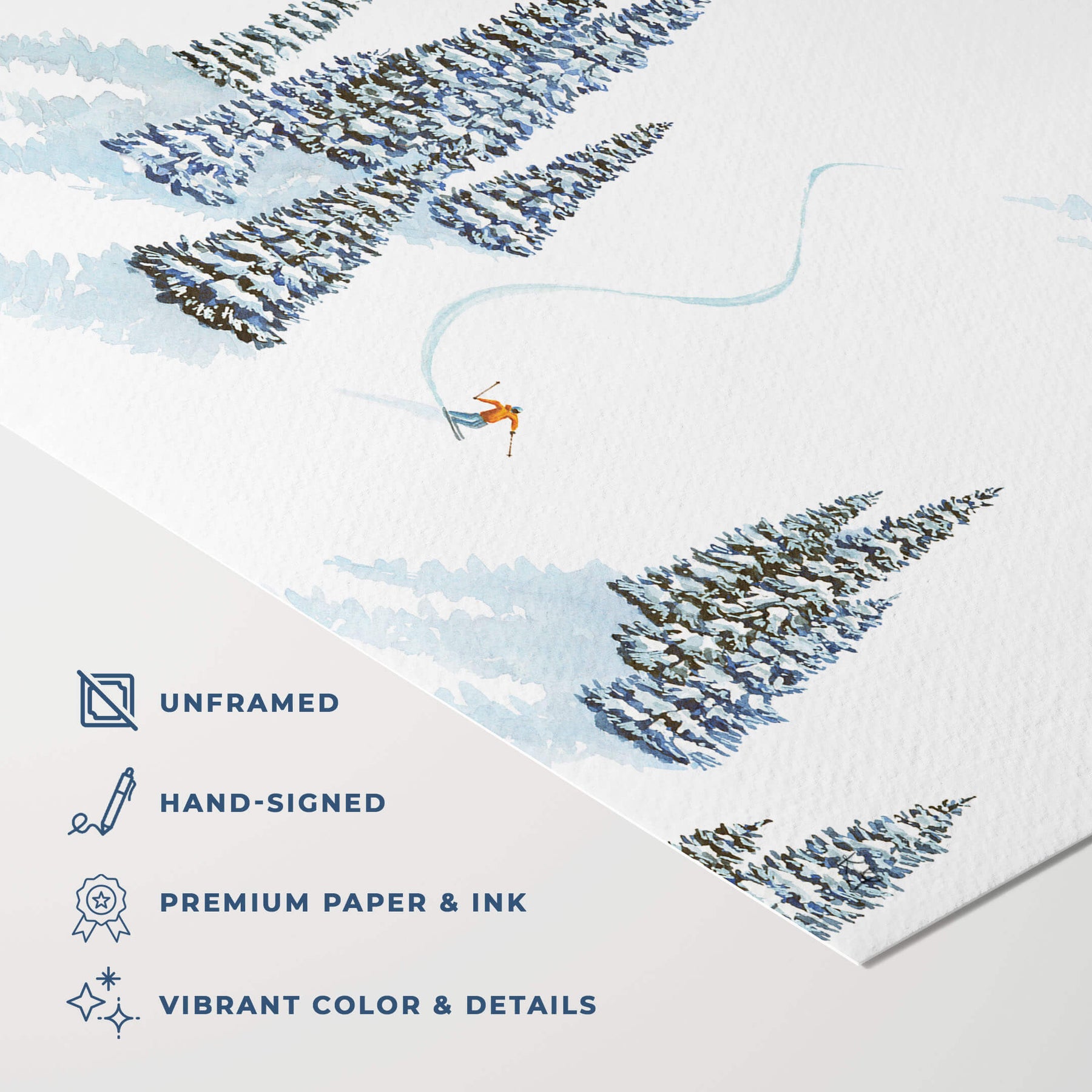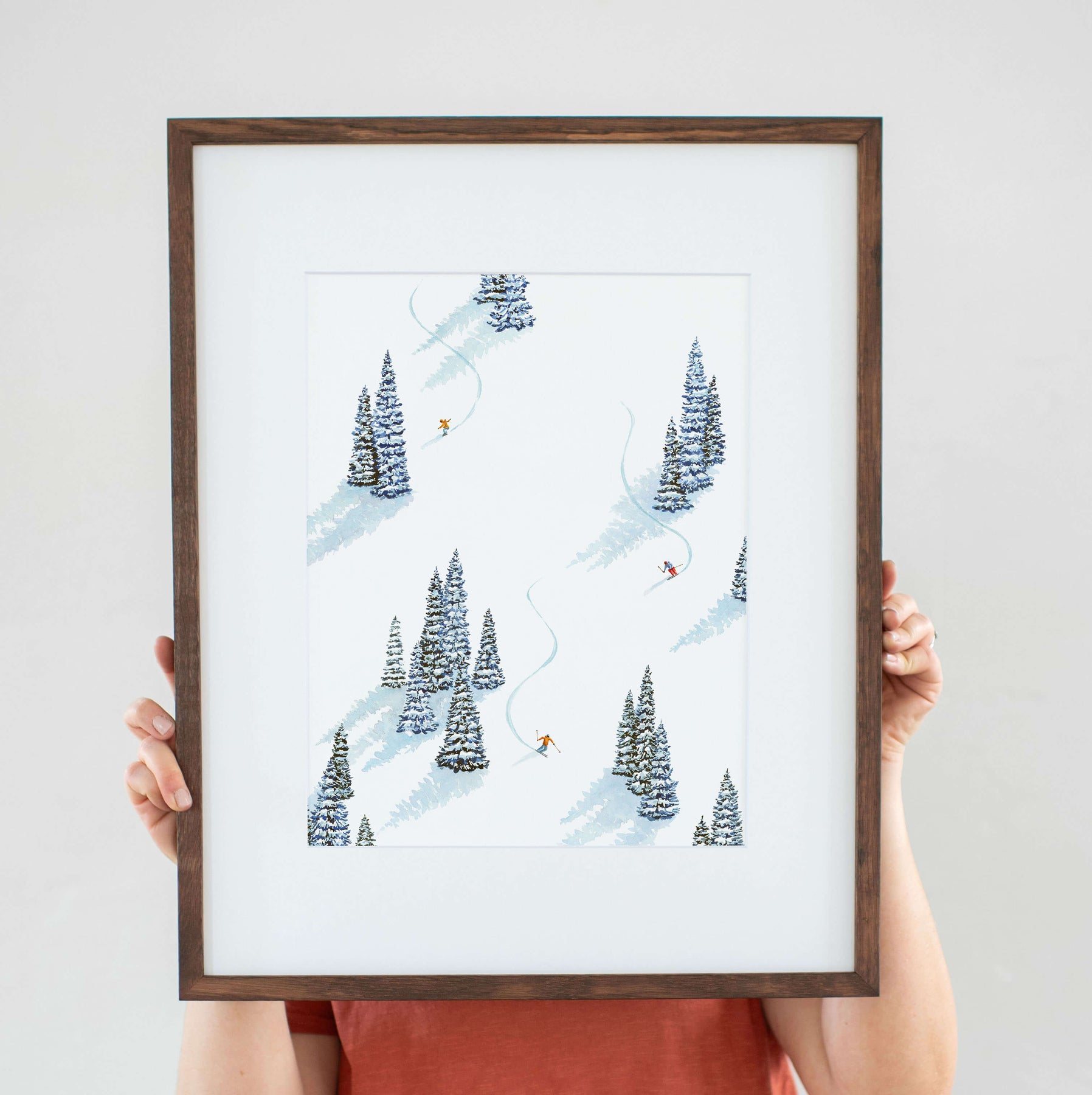 Celebrate the magic of first tracks with Fresh Powder, a serene winter watercolor featuring skiers and a snowboarder gliding through snowy evergreens with epic trails behind them. A peaceful and playful nod to snowy escapes and alpine adventure.
