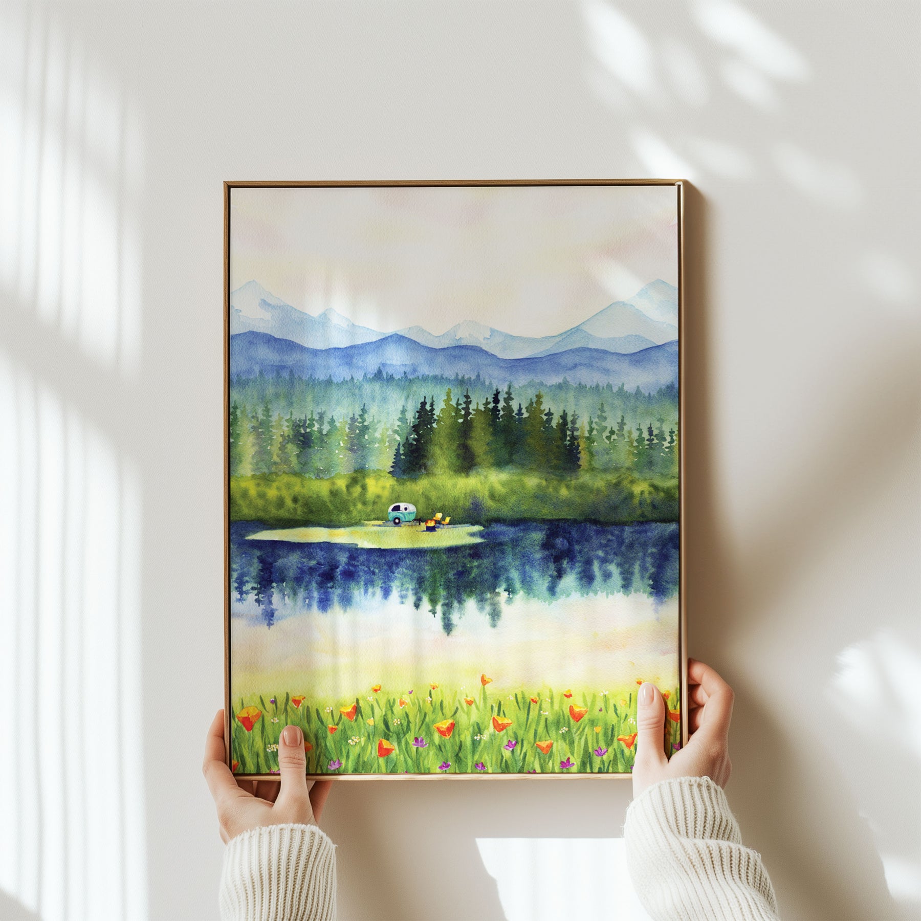 Step into the world of 'Summer Wanderlust,' where colorful wildflowers bloom in the foreground, and a calm lake reflects the warm hues of a setting sun. Far away, you'll find towering trees and grand mountains.